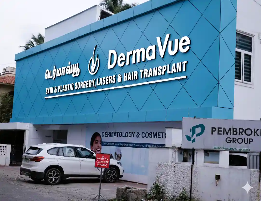 DermaVue Coimbatore is a physician-owned dermatology clinic at Gandhipuram staffed by three board-certified MD DVL dermatologists, including a dermatosurgeon with 8 years of experience. The clinic operates US-FDA approved Q-Switched Nd:YAG, Fractional CO2, and Diode 810nm laser systems for 22+ treatments covering medical dermatology, hair transplant, cosmetic procedures, and laser hair removal. The first physician-owned dermatology chain from Kerala to operate in Tamil Nadu, DermaVue's Coimbatore clinic serves patients from Gandhipuram, RS Puram, Saravanampatti, and Peelamedu, as well as extended areas including Tiruppur and Pollachi. Rated 4.9 stars with 123+ reviews.