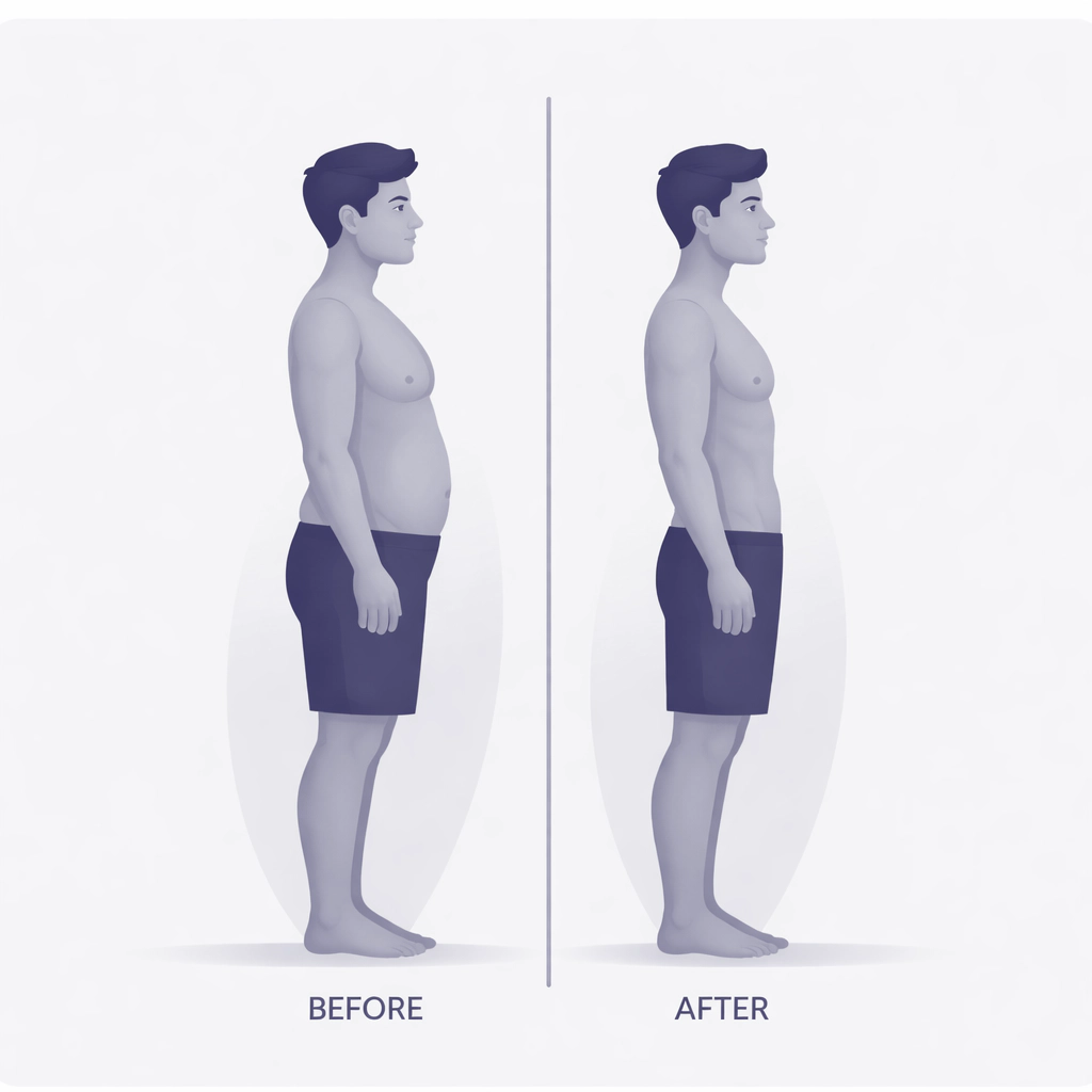 Most patients notice reduced appetite within week one. Visible belly fat reduction typically begins by week 4-6. Meaningful results (10-15% body weight) occur by months 4-6. Visceral belly fat often reduces faster.