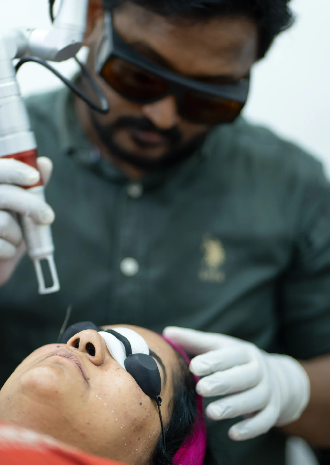 The clinic operates US-FDA approved laser systems: Q-Switched Nd:YAG (pigmentation, tattoo removal), CO2 fractional (acne scars, resurfacing), Diode 810nm (hair removal), and IPL (vascular lesions, photorejuvenation). All laser procedures are performed by the treating dermatologist, not technicians.