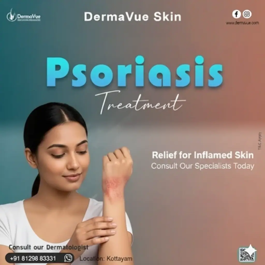 Get comprehensive psoriasis treatment from board-certified dermatologists at DermaVue Kottayam, offering advanced therapies for all types including scalp psoriasis, guttate psoriasis, and psoriatic arthritis-related skin conditions. Located above KFC kottayam on MC road, our specialized clinic serves patients across Kottayam seeking effective, long-term psoriasis management beyond basic treatments.