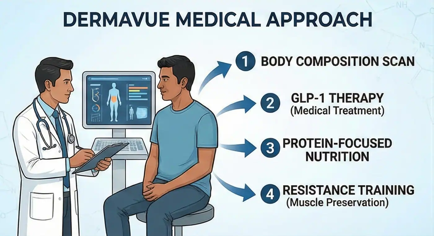 Struggling to reduce belly fat despite trying every diet plan for weight loss? At DermaVue Thrissur, our physician-led team offers doctor-supervised medical weight loss using GLP-1 medications — not crash diets or temporary fixes.