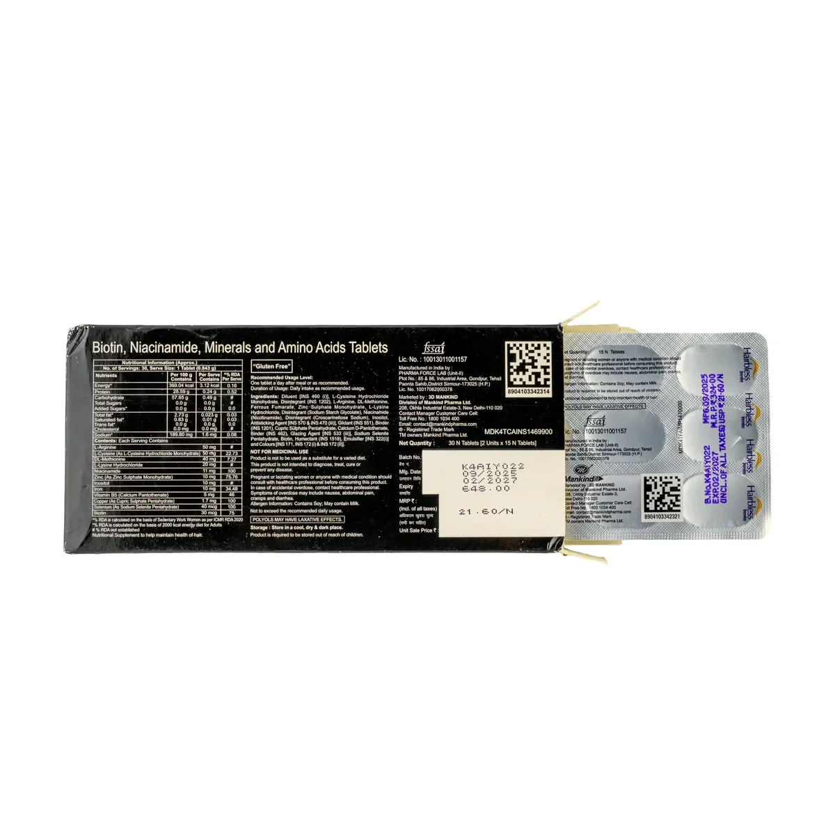 Biotin, Niacinamide, Minerals and Amino Acids. Each tablet contains: Biotin 5000 mcg, L-Cysteine Hydrochloride, Zinc Sulphate Monohydrate, Niacinamide, Calcium Pantothenate, Ferrous Fumarate, Copper Sulphate, Selenium Dioxide. Other Ingredients: Diluent (MCC), Hydroxypropyl Methylcellulose, Glycerine, Binder (PVP K30), Croscarmellose Sodium, Bulking Agent, Colour: Red Oxide of Iron, Talc, Sodium Starch Glycolate, Disintegrant