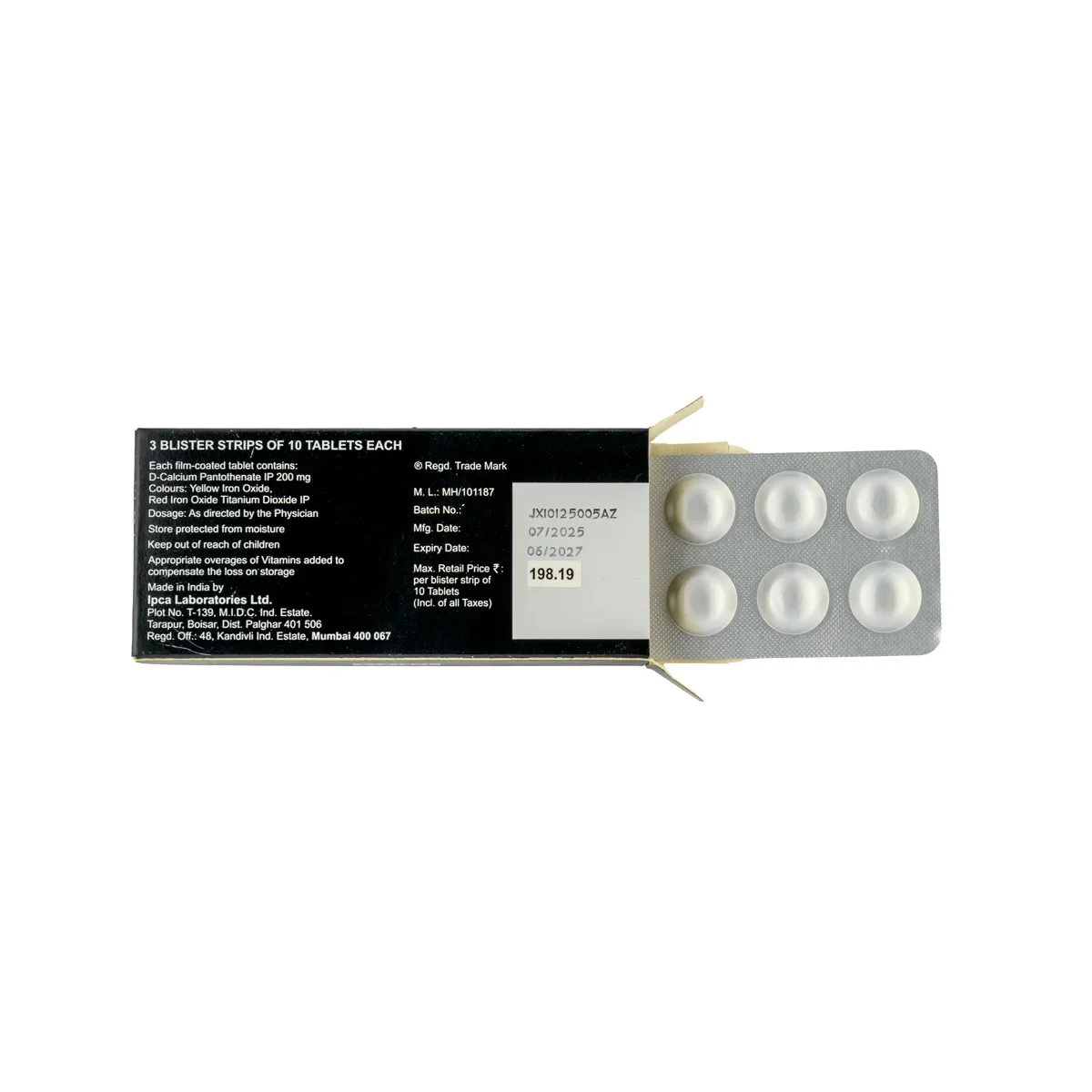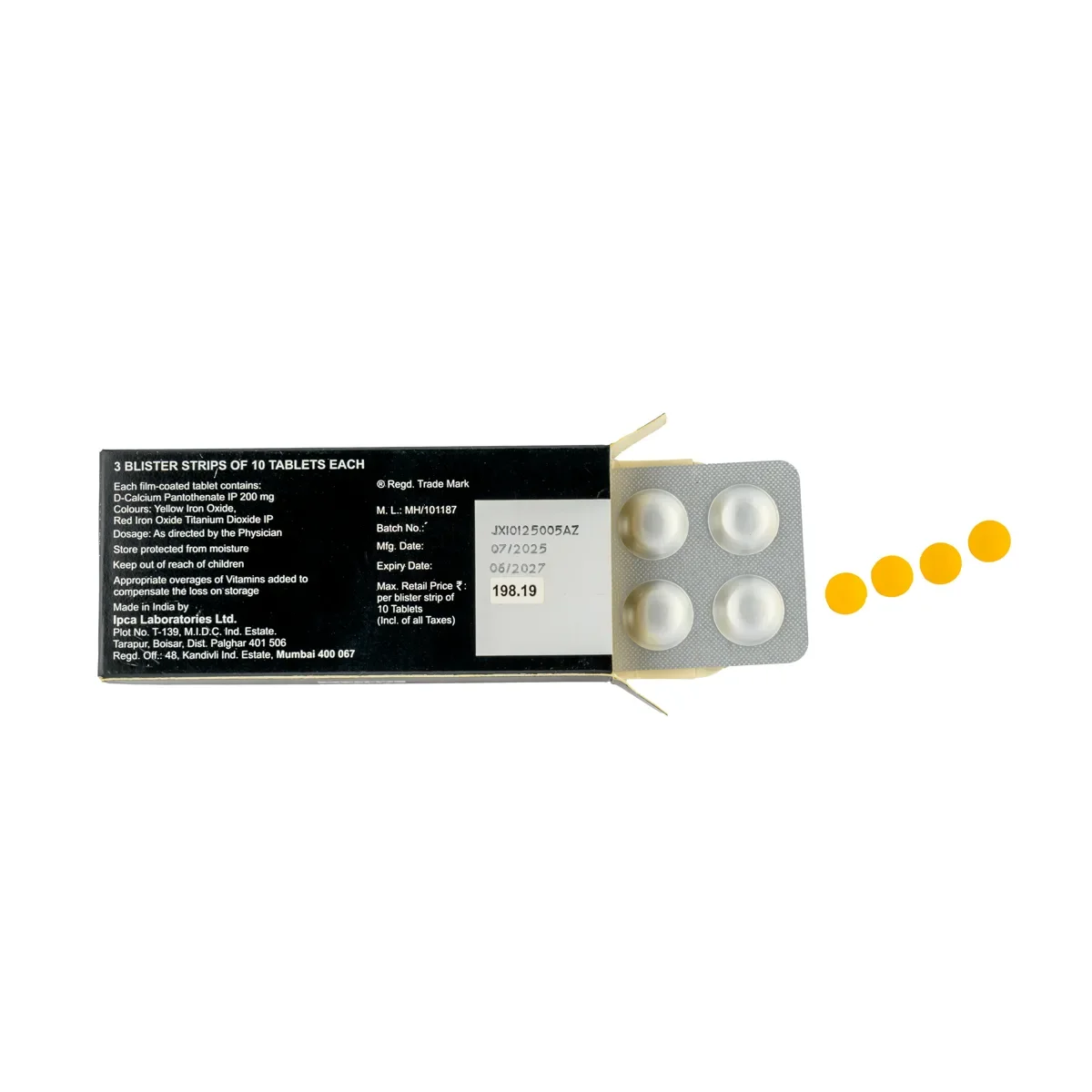 Each film-coated tablet contains: D-Calcium Pantothenate IP 200 mg. Colours: Yellow Iron Oxide, Red Iron Oxide, Titanium Dioxide IP